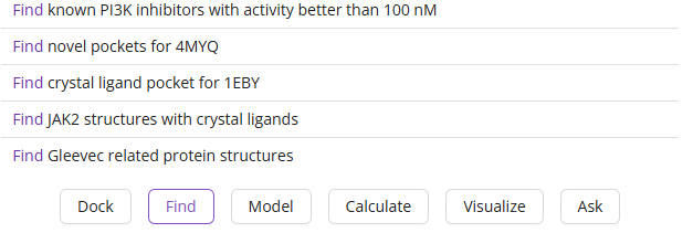 - Data Search: Find information about ligands and proteins and their homologs- from multiple public databases (PDB, ChEMBL, UniProt, PubChem, BindingDB, AlphaFold, Open Targets)